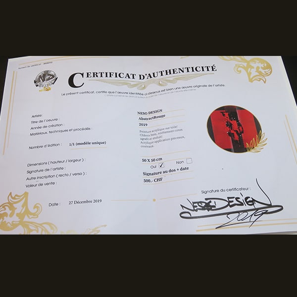 Chez Neso Design Shop, toutes nos œuvres sont uniques et délivrées avec un certificat d’authenticité.